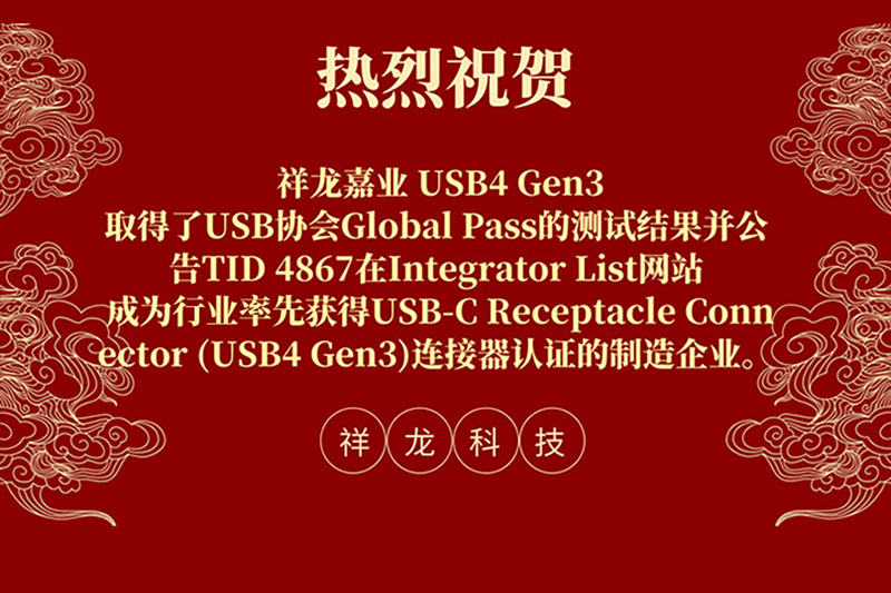 USB4™ Gen3连接器 | 恭喜祥龙嘉业在百佳泰完成USB-C Receptacle 40Gbps认证